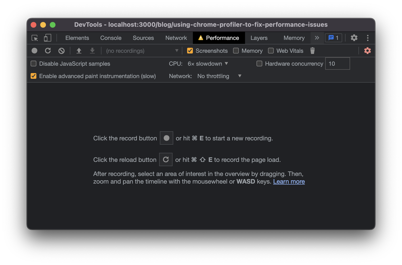Performance Panel’s landing page / empty state