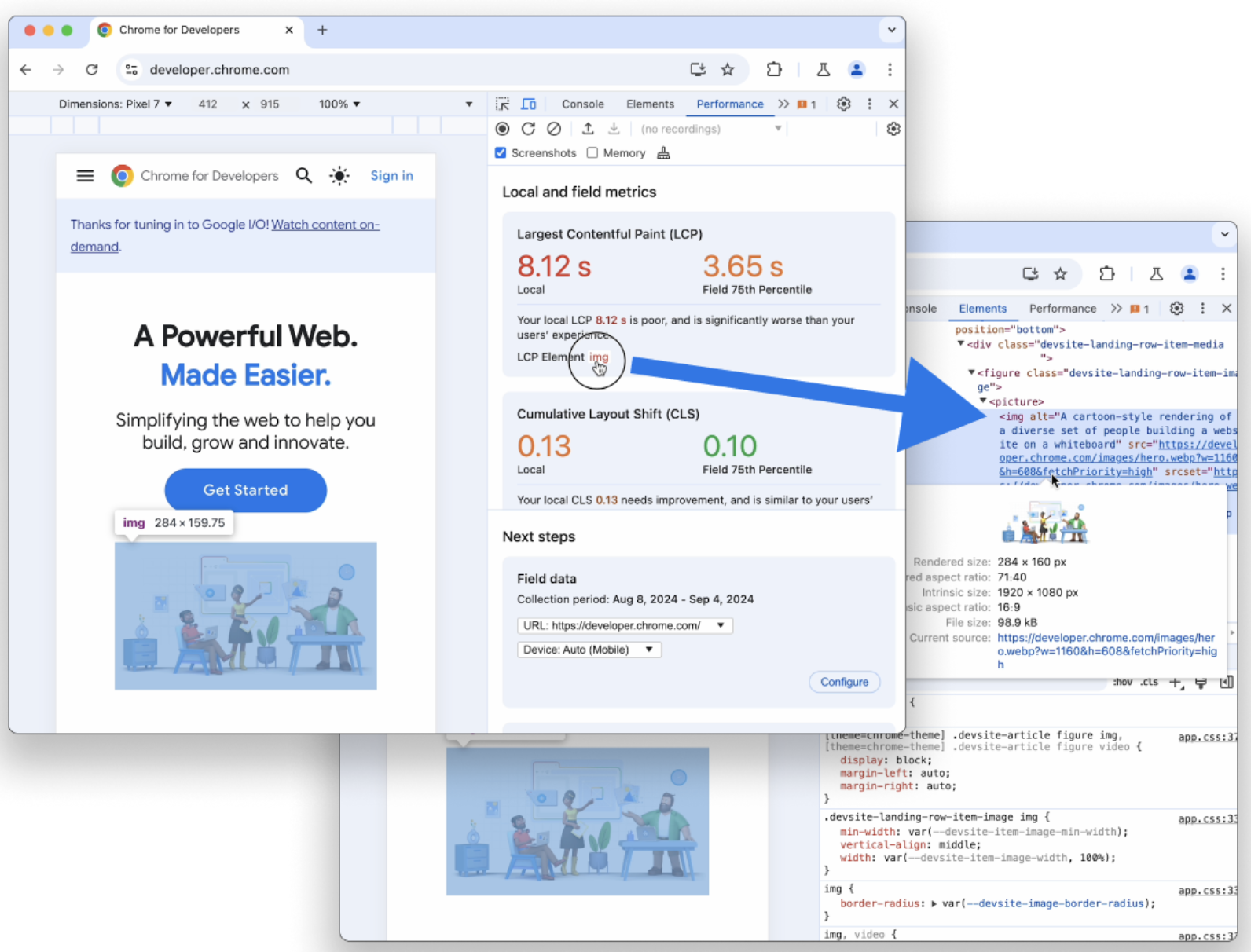 - Inter & Intra-panel context-switching: There were several instances of back-and-forth switches to access key information and features within & between the Performance Panel and other panels in DevTools. This caused frustration & friction, with several repetitive moments to access information that was key to continue workflows. We reduced this by looking at ways to move and provide in-context info through the new Insights Sidebar, new Live View landing page, tooltip hovers (ex.), shortcuts to switch & jump to information, and in some cases reorganizing the information architecture to better surface information(ex.).